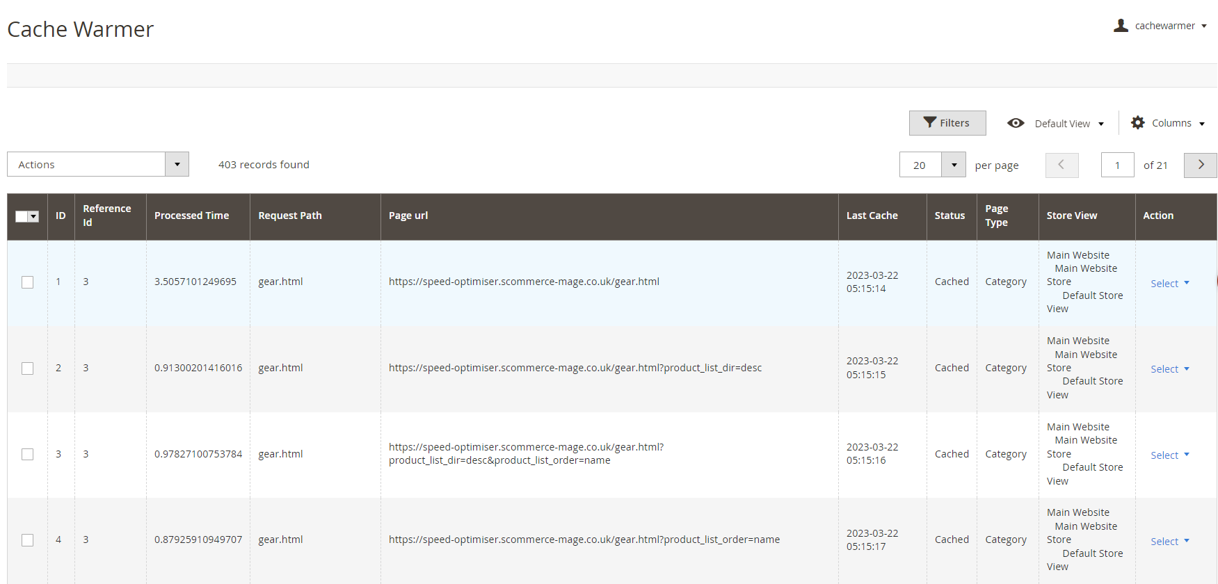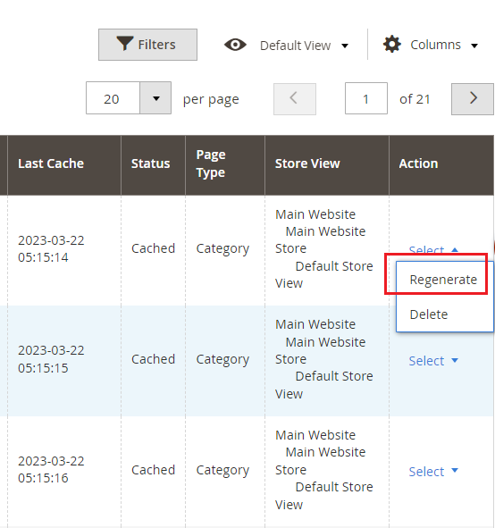 When you enable the module and set General Settings > Can Regenerate Cache Manually > to "Yes" then it adds an additional option "Regenerate" under the "Actions > Select" drop-down at Admin > System > Cache Warmer > Actions. This grid will have Id, Reference Id, Processed Time, Request Path, Page URL, Last Cache - (Date, Time ), Status - (Cached/Un-cached), Page Type - (Home, Product, Category, CMS), Store View, and Action- (Regenerate, Delete).