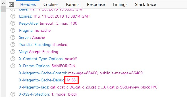 • Cache Miss for the Category Page - Flush the cache by executing the command, c:f and then check cache using browser tool at, Network > Select Page URL > Header > X-Magento-Cache-Debug : MISS