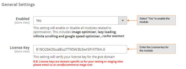 • License Key – Please add the license for the extension which is provided in the order confirmation email. Please note license keys are site URL specific. If you require license keys for dev/staging sites then please email us at support@scommerce-mage.com.