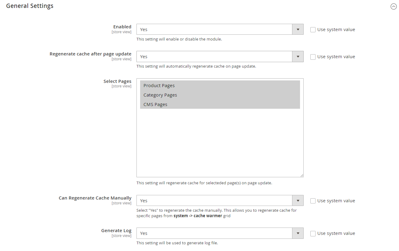 • Can Regenerate Cache Manually - Please select " Yes" or "No". If set to "Yes" then you can regenerate cache manually from cache warmer grid.