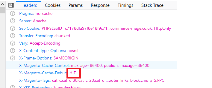 • Cache Hit for the Category Page After the Execution of Category Page Command - When you execute the command for category page then it regenerates the cache and on the front-end you check the status "Hit" or "Miss" using browser tool (Inspect element) at Network > Select Page URL > Header > X- Magento-Cache-Debug : HIT