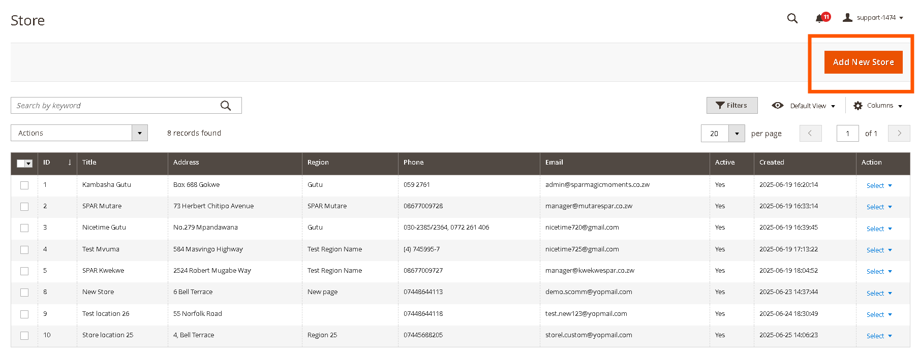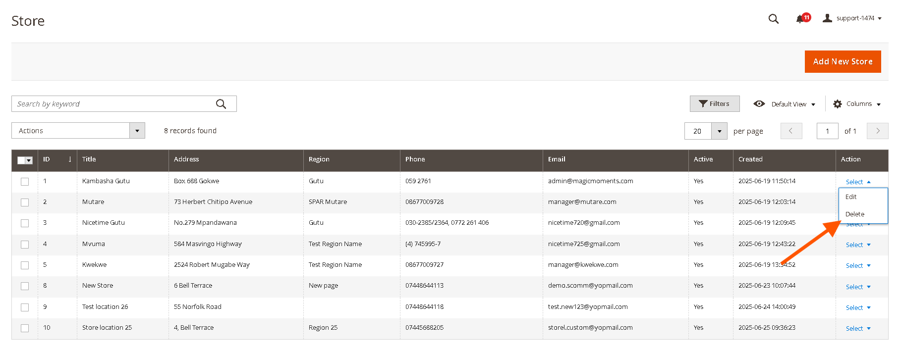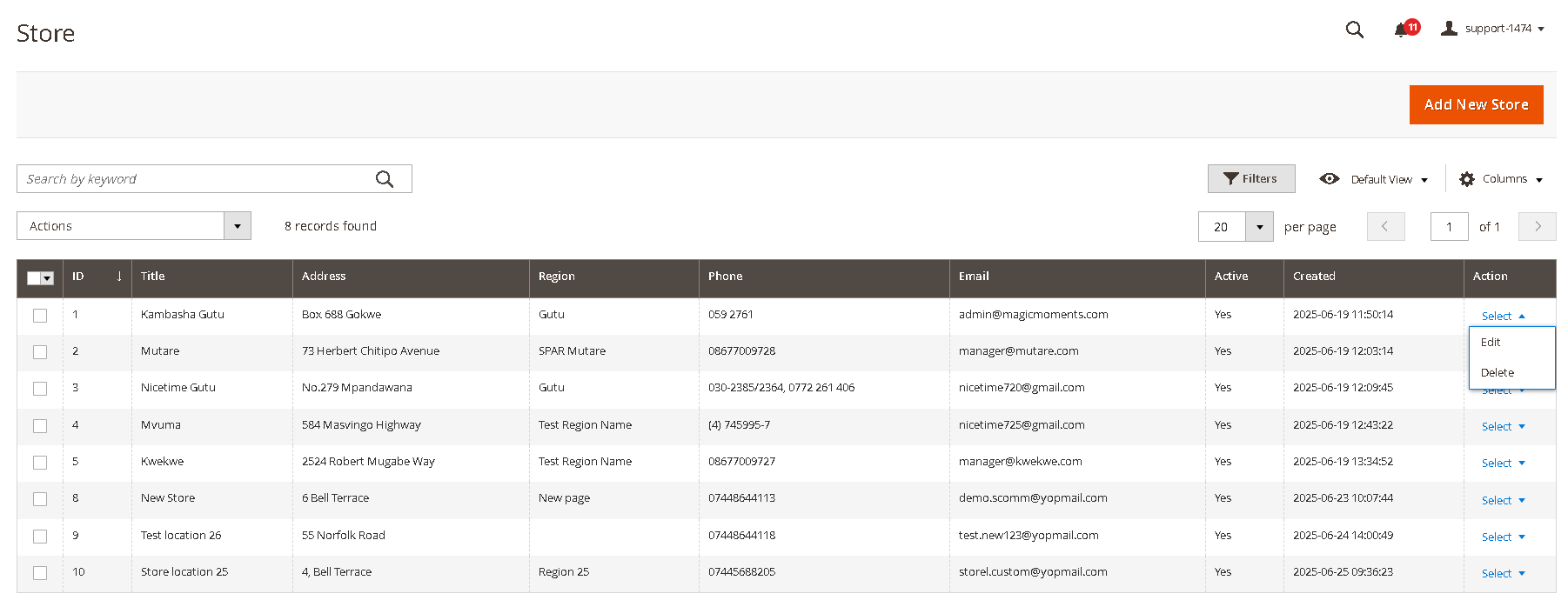 - From the Store Locations grid, locate the store you wish to edit. The grid displays ID, Title, Address, Region, Phone, Email, Active, Created, and Actions.