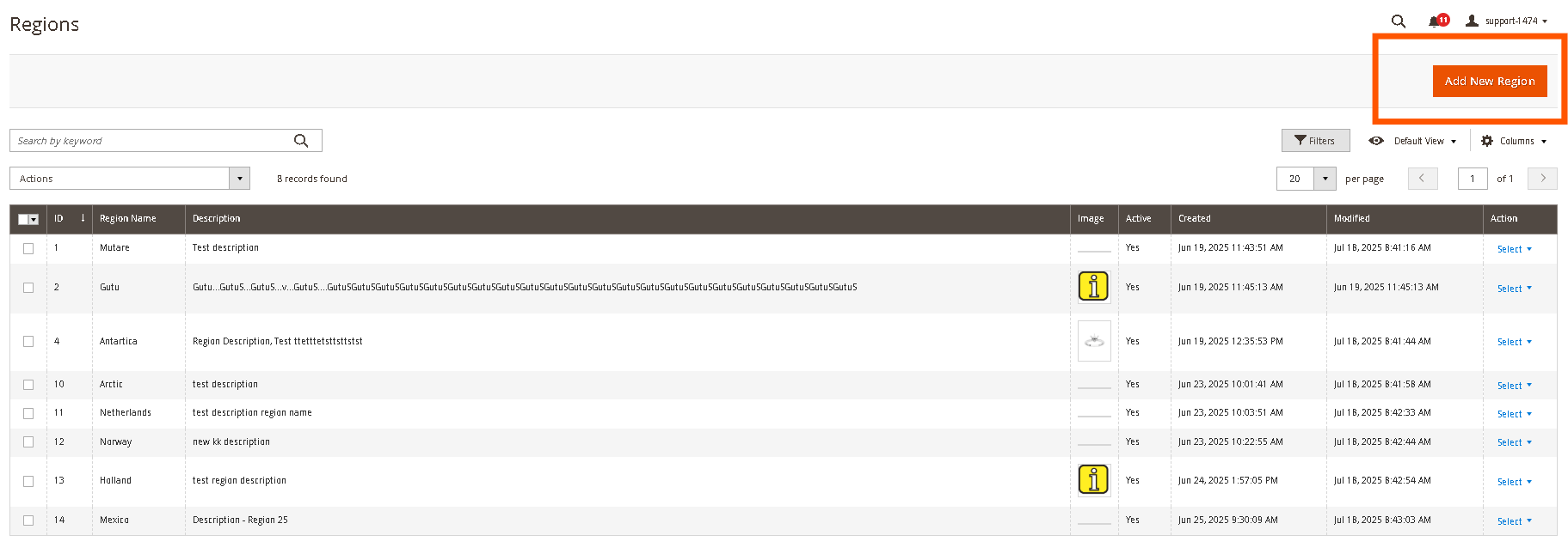 Once a region is successfully deleted, it will be removed from the grid and will no longer appear as an option for store categorization or on the front-end store locator navigation.