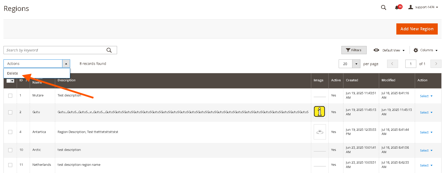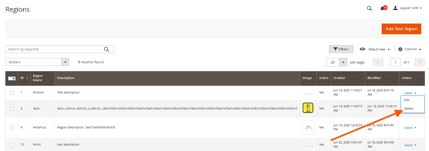 From the Region Management grid, locate the region you wish to delete.