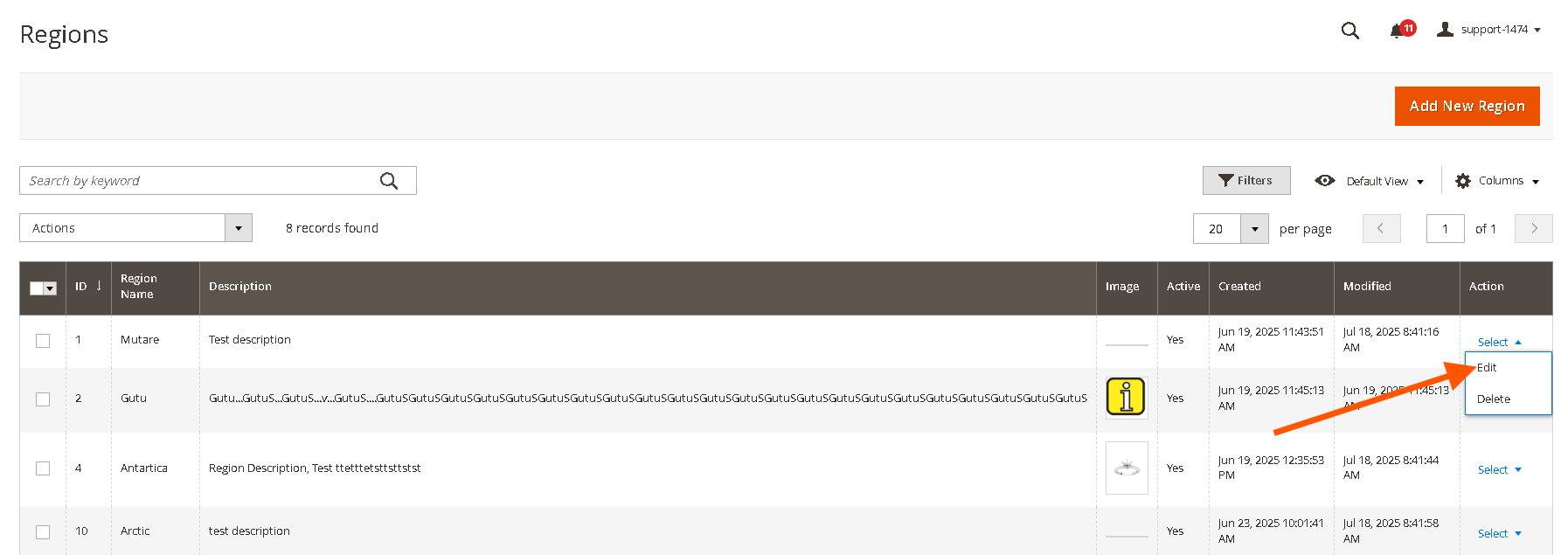 From the Region Management grid, locate the region you wish to edit.