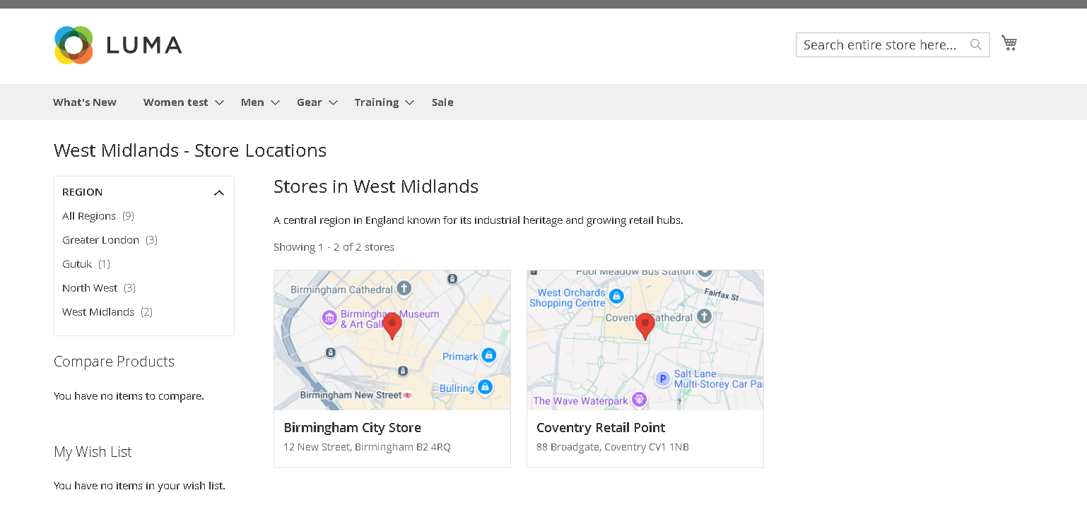 - If at least one store is linked to a region, the available regions will be displayed in the left-hand navigation based on the aforementioned configuration.