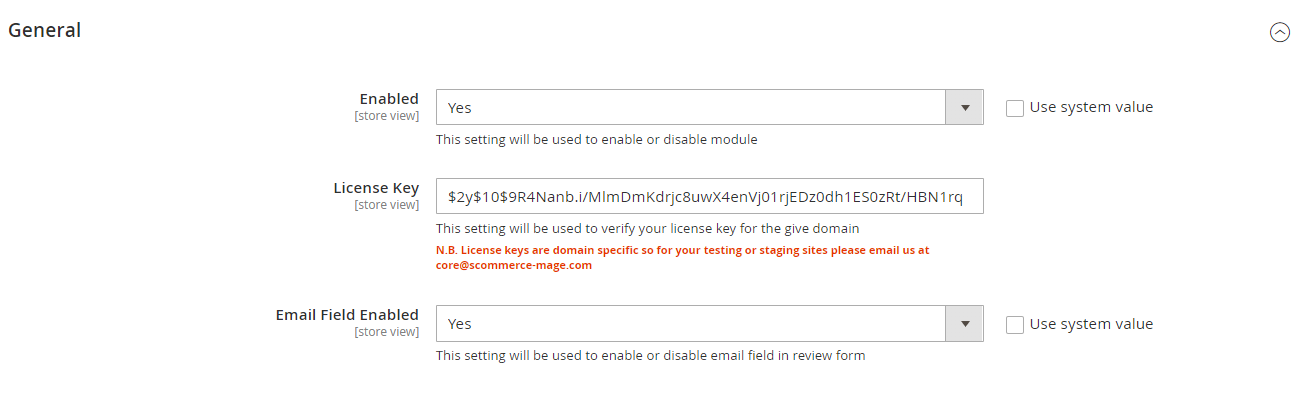 - **License Key –**Please add the license for the extension which is provided in the order confirmation email. Please note license keys are site URL specific. If you require license keys for dev/staging sites then please email us at support@scommerce-mage.com.