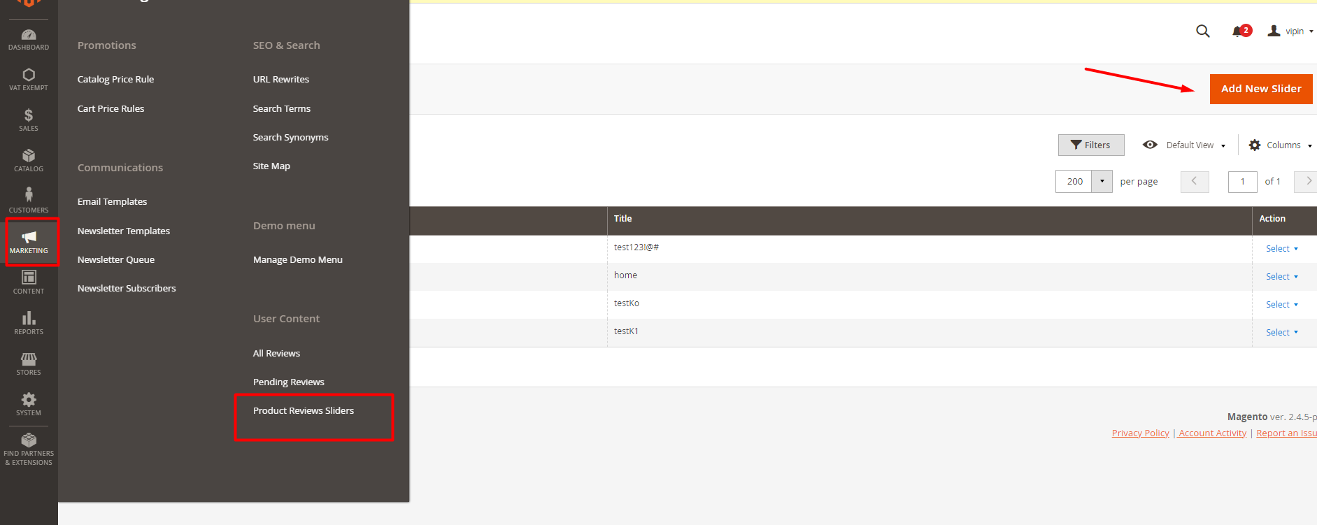 Go to 'Marketing'->'Product Review Slider'