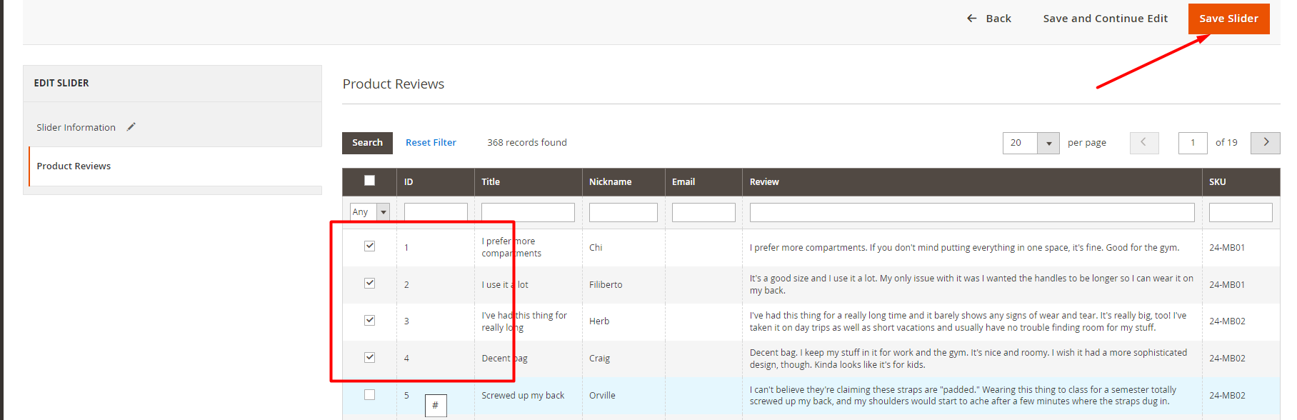 In 'slider information' fill the title then go to 'product reviews'. and you will be able to see approved reviews.