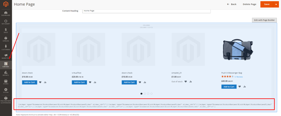 - Under 'Content' group, go to 'Product Reviews Slider' and add one of the Review Slider you have created.