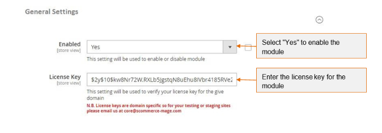 - **License Key –**Please add the license for the extension which is provided in the order confirmation email. Please note license keys are site URL specific. If you require license keys for dev/staging sites then please email us at support@scommerce-mage.com.
