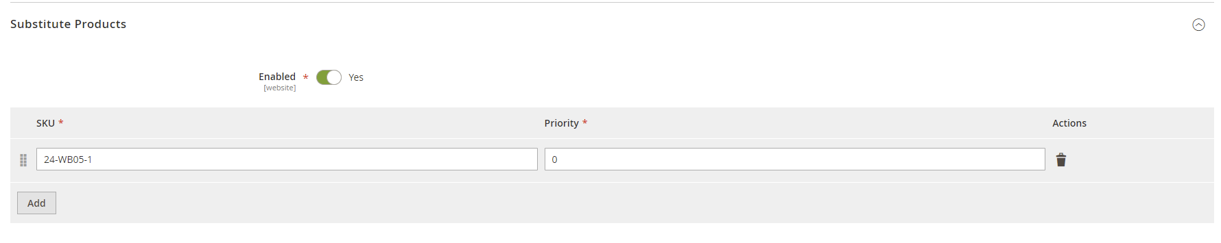 Click on Enabled to enable the substitute products for this main product. Add the SKU of the product that you want to add as a substitute of this product and add the priority. In case of multiple substitute products you can set the priortiy highest being 0 so that whenever products are out of stock, upon order placement the SKU will be chosen based on the priority set.