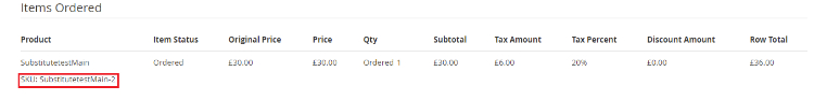 Suppose our main product is out of stock then when a customer visits the storefront they will always see the product available as long as the substiute product assigned is in stock. Orders placed with the main product will be fullfilled with the subsitute product. Place an order with the main product then go to Admin>Sales>Orders, and select your order. We can see the substitute product SKU in the order detail since main product is out of stock.